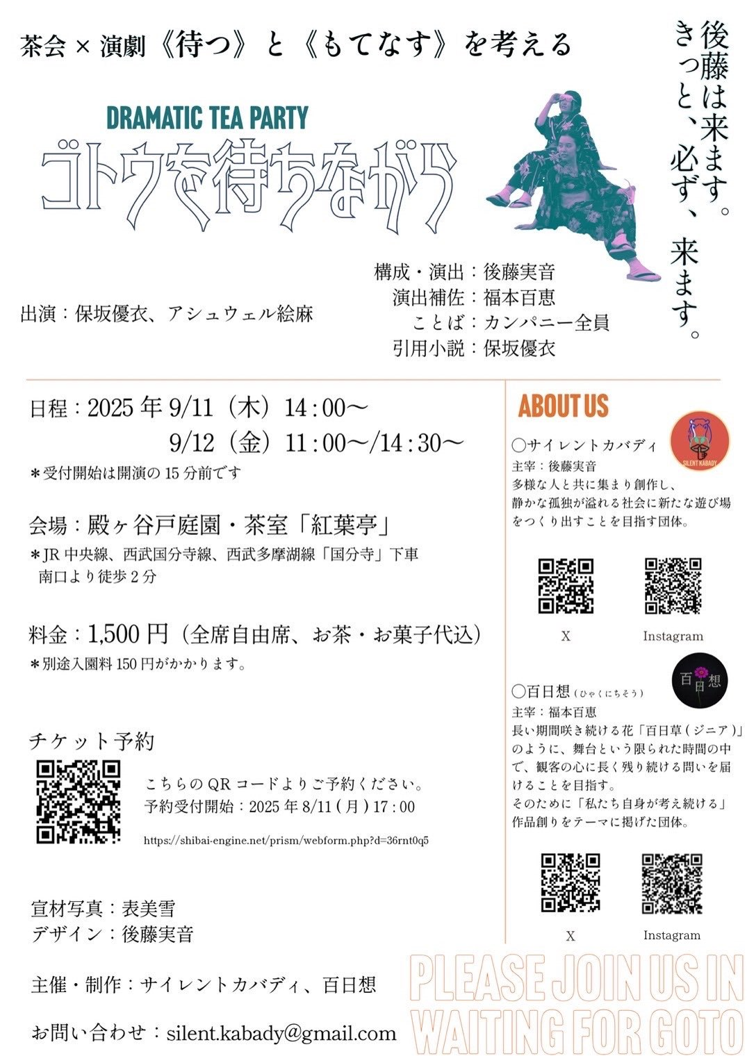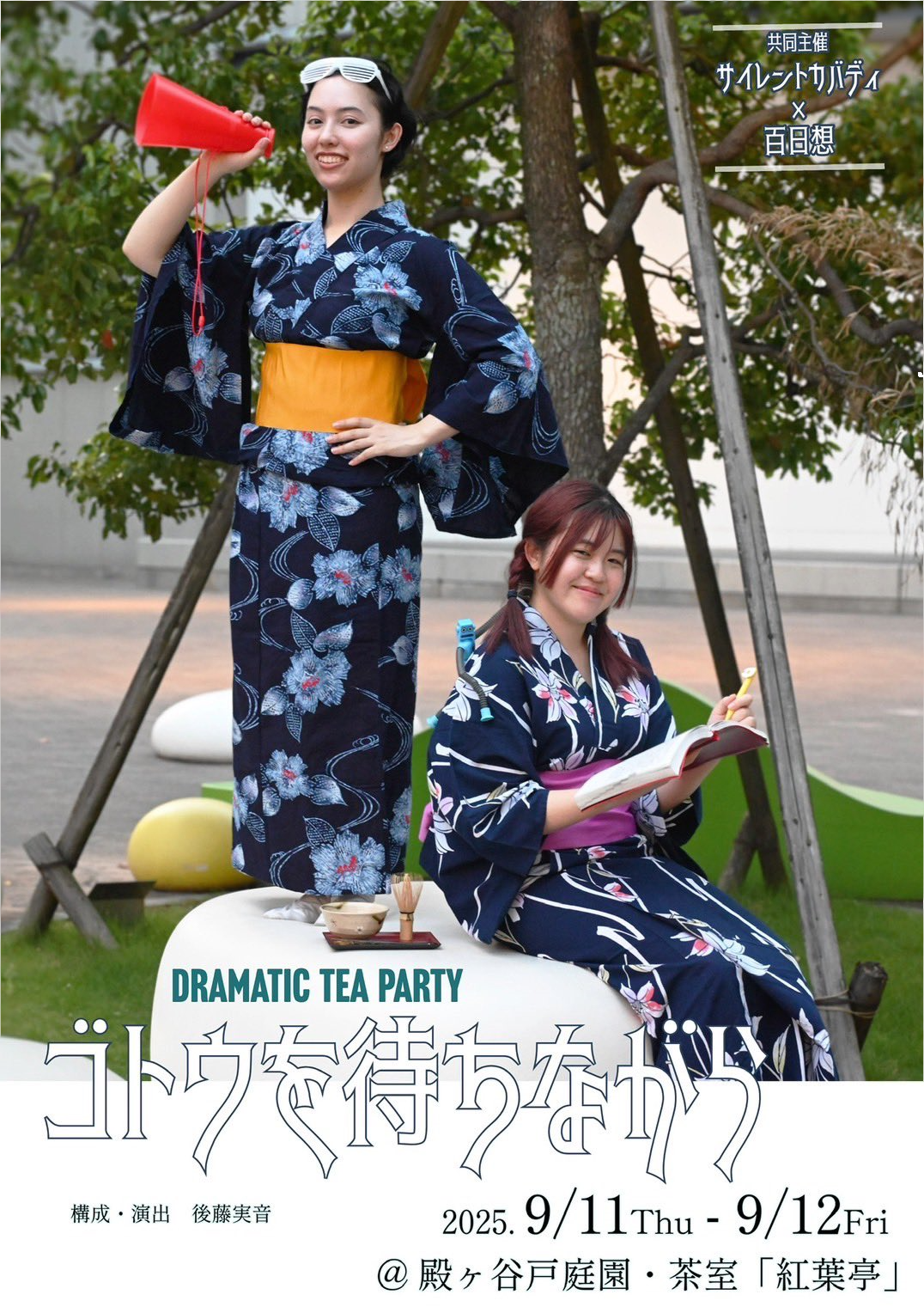上演記録 2025.11.272025.11.29 サイレントカバディ×百日想共同主催 DRAMATIC TEA PARTY『ゴトウを待ちながら』 作:後藤実音演出:後藤実音・福本百恵日時:2025/09/11~2025/09/12殿ヶ谷戸庭園内茶室「紅葉亭」(国分寺市)